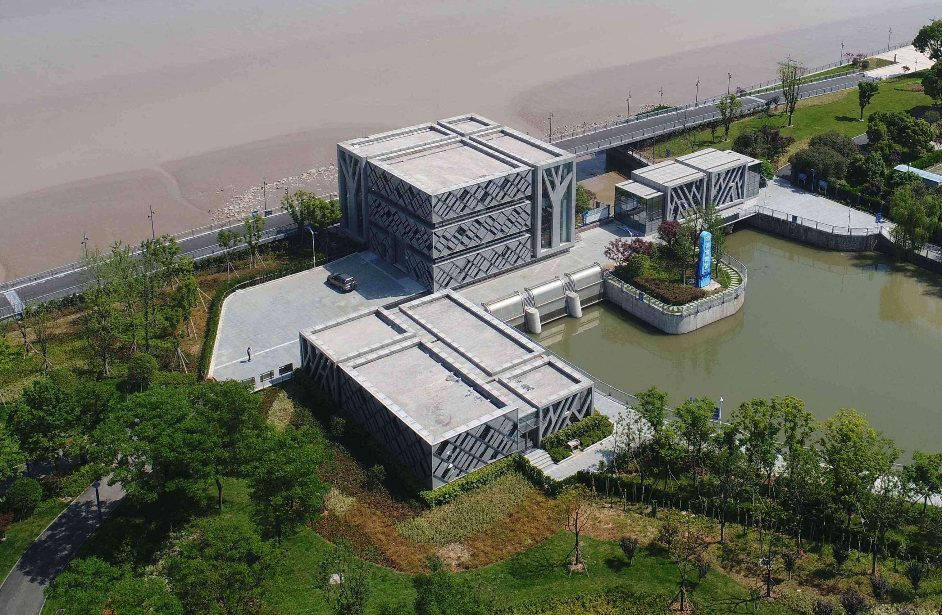 工程通過抽象手法,將樹、落葉等元素融入到建筑表情之中,從而閘站更像是沿江公園里面的雕塑,通過虛實的結構處理,弱化了高大廠房結構的厚重感。