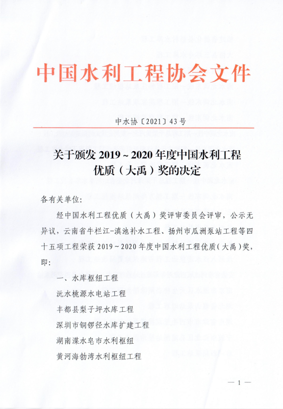 2019-2020年度中國水利工程優(yōu)質(大禹)獎