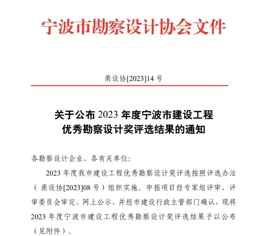 喜報 | 我院兩大項目榮獲2023年度寧波市優(yōu)秀勘察設(shè)計獎!