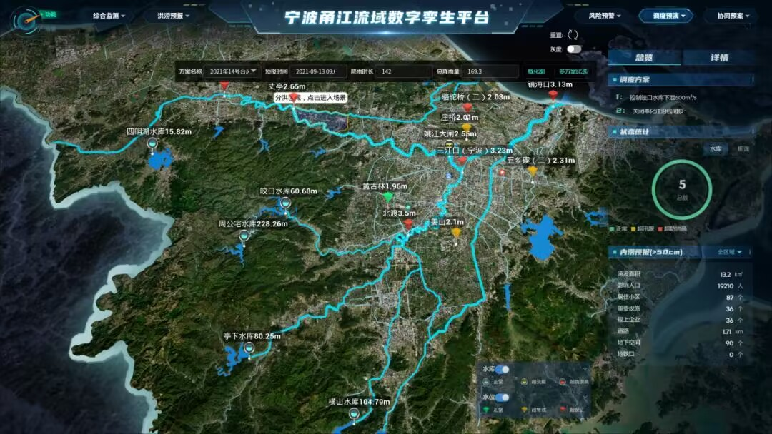 目前,基于寧波甬江流域數(shù)字孿生平臺打造的防洪應用已完成“綜合監(jiān)測、洪澇預報、風險預警、仿真預演、協(xié)同預案”5大功能板塊的開發(fā)和“三江堤防、沿海海塘、重點水庫、重要設施內(nèi)澇”4個“四預”場景的應用。