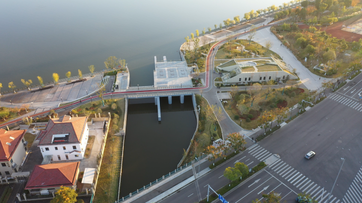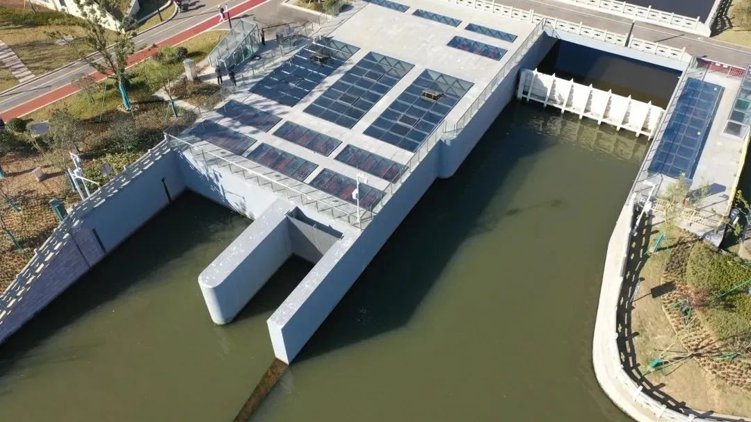 與常見的泵站不同,洋市中心河泵站以公園式城市排水泵站為設計理念,采用無廠房結構,將泵站主體結構置于地下,降低對沿江視線的遮擋,地面則與城市景觀有機融合,既能排水又可供市民休閑觀景。