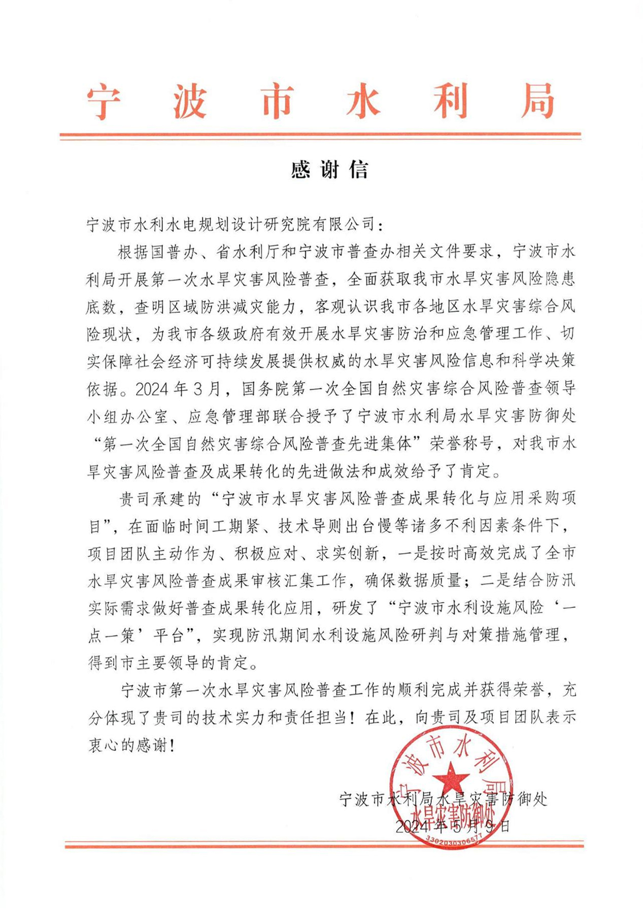 為寧波市水利院點(diǎn)贊——一封來(lái)自寧波市水利局水旱災(zāi)害防御處的感謝信