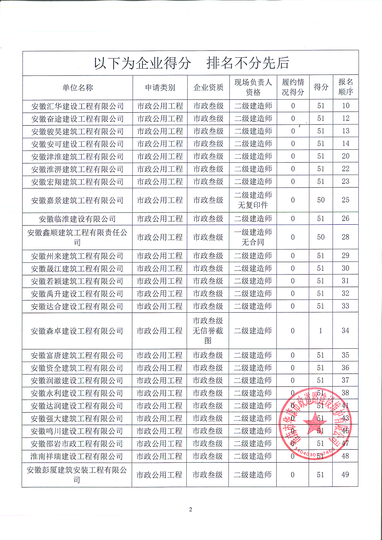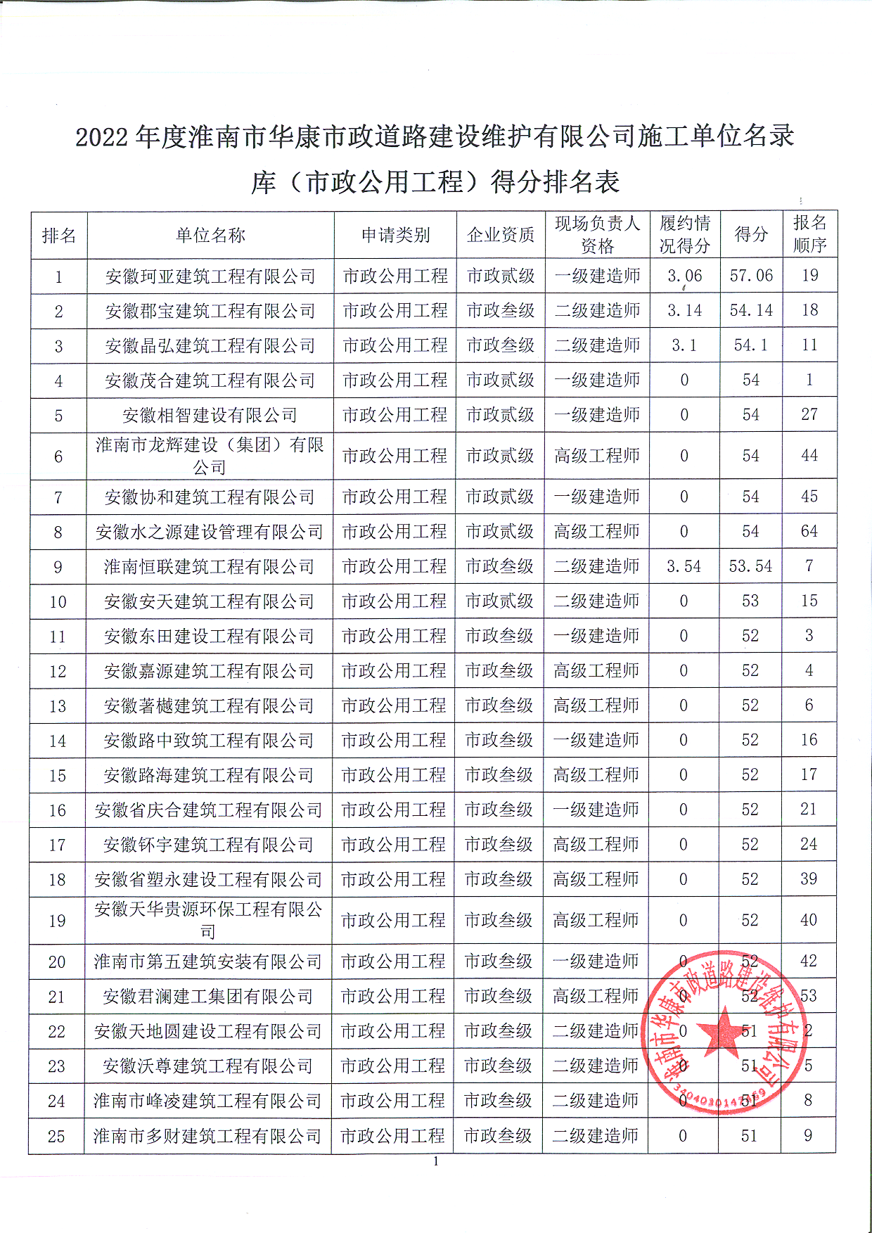 根據(jù)《2022年度淮南市華康市政道路建設(shè)維護(hù)有限公司工程建設(shè)項目施工勞務(wù)單位名錄庫征集公告》相關(guān)規(guī)定,目前已按公告規(guī)定的評審方法完成評審工作?,F(xiàn)將評審結(jié)果公示如下:見附表